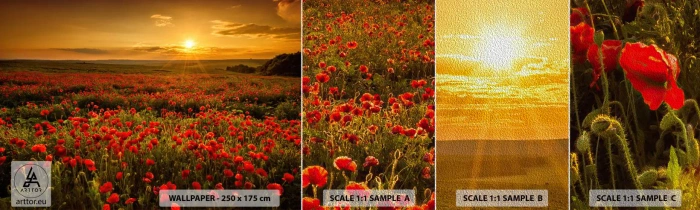 Muestra de fotomural Premium Sand - Entre los campos de flores - Paisaje, flores, amapolas - 100x30 cm
