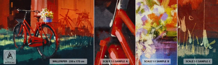 Muestra de fotomural Premium Sand - Quiero ir en bicicleta - bicicleta antigua, flores en maceta, Viaje - 100x30 cm