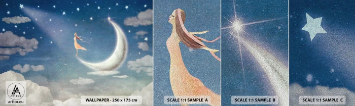 Muestra de fotomural Premium Sand - Pretendiente sobre azul - Abstracción, Para niños, Luna - 100x30 cm