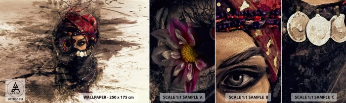 Muestra de fotomural Premium Sand - Inquietante, como mínimo - Abstracción, cara de mujer, Símbolos orientales - 100x30 cm