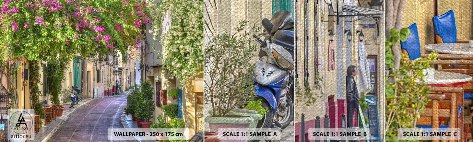 Muestra de fotomural Premium Canvas - Un callejón floreciente - Arquitectura, Grecia, Ciudad - 100x30 cm