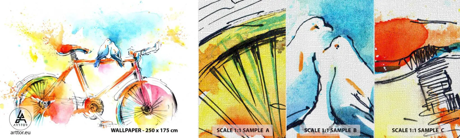 Muestra de fotomural Premium Canvas - Dos en bicicleta - Abstracción, Bicicleta, Aves - 100x30 cm