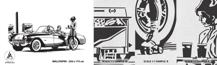 Muestra de fotomural Premium Canvas - Años 60 - la América despreocupada - Auto Vintage, Gasolinera, America - 100x30 cm