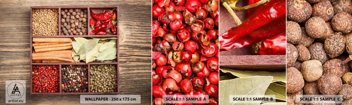 Muestra de fotomural autoadhesivo Deluxe Sticker - Orden de formas, composición de aromas - Gastronomía, Especias, Chile - 100x30 cm