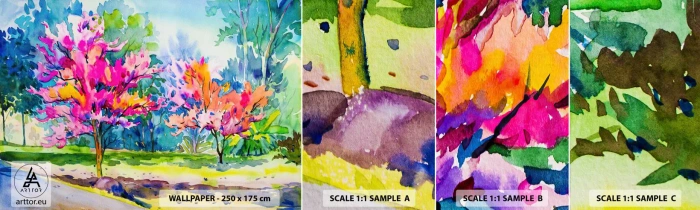 Muestra de fotomural autoadhesivo Deluxe Sticker - Un jardín de arco iris en el esplendor de la primavera - Parque, Árboles, Naturaleza - 100x30 cm