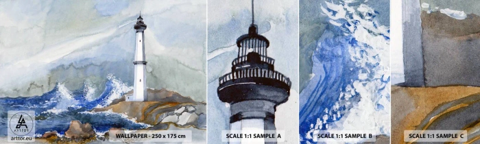 Muestra de fotomural autoadhesivo Deluxe Sticker - Contra la oscuridad y la tormenta - Faro, Paisaje, Océano - 100x30 cm