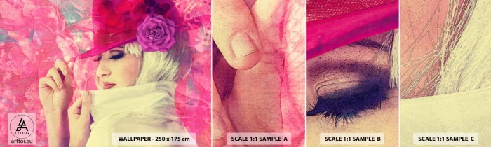 Muestra de fotomural autoadhesivo Deluxe Sticker - Retrato retro en rosa - mujer con sombrero, flores, Moda - 100x30 cm