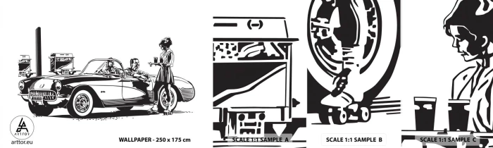 Muestra de fotomural autoadhesivo Deluxe Sticker - Años 60 - la América despreocupada - Auto Vintage, Gasolinera, America - 100x30 cm