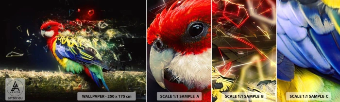 • Resumen, loro, pájaro, animales, Para la oficina, Para el estudio, Para el comedor, Para el recibidor, Para el salón, Para el dormitorio, Negro, Rojo, Azul, Amarillo, Colorido, Horizontal