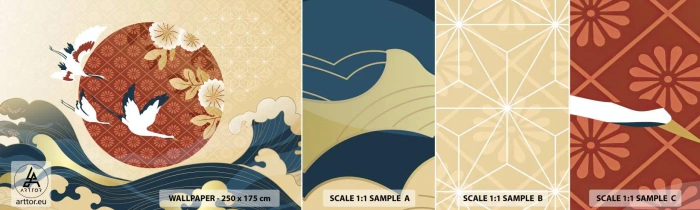 Muestra de fotomural autoadhesivo Deluxe Sticker - Un cuento de hadas japonés - Garza, Pájaro, Abstracción - 100x30 cm