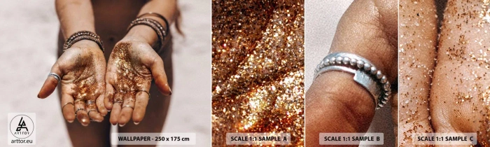 Muestra de fotomural autoadhesivo Deluxe Sticker - Un regalo para ti - manos de mujer, bohemia, Oro - 100x30 cm