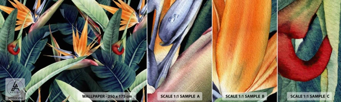 Muestra de fotomural autoadhesivo Deluxe Sticker - Flores de llamas de los trópicos - Strelitzia real, Flor, África - 100x30 cm