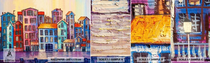 Muestra de fotomural autoadhesivo Deluxe Sticker - Una ciudad como un cuento de hadas - Pedazo, Casas de vecindad, Ciudad - 100x30 cm