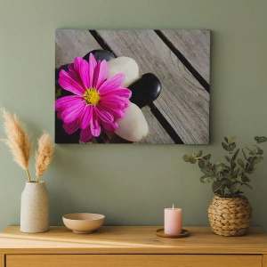 Cuadro sobre lienzo - Impresión de Imagen - Flor rosa sobre un fondo de tablas de madera con piedras. - 140x50cm - Descansando en el muelle - Decoración de pared moderna para salón y dormitorio ARTTOR