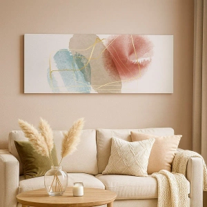 - Una pintura con formas abstractas en tonos pastel y líneas doradas. Una composición minimalista y elegante, perfecta para interiores modernos y sofisticados.