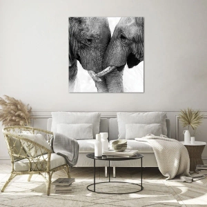 Cuadro sobre vidrio - Impresiones sobre Vidrio - Dos elefantes tocándose la frente en blanco y negro - 70x50cm - Una confesión sincera - Decoración de pared moderna para salón y dormitorio ARTTOR
