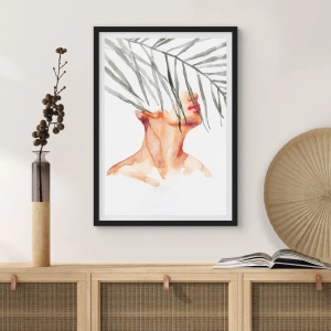Póster en marco negro - Mujer de acuarela con hojas de palma cubriéndose la cara - 50x70cm - Siente el pulso de los trópicos - Decoración de pared moderna para salón y dormitorio ARTTOR