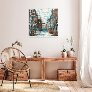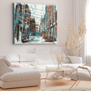 El lienzo "Paisaje urbano en tonos azules y naranjas" es una composición moderna que combina la armonía de colores con el dinamismo de la vida urbana. La composición representa un fragmento de la ciudad, donde los acentos azules y naranjas se entrelazan, creando un efecto enérgico y artístico. Los detalles abstractos le otorgan un carácter único, enfatizando a la vez el ritmo y la estructura urbana.