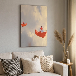 Cuadro mural - Viaje de los Soñadores - Barquitos de papel rojos flotando en las nubes