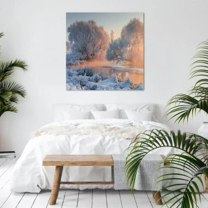 - Un mágico paisaje invernal con árboles nevados bañados por los rayos del sol poniente. El río refleja delicadamente la luz, creando una sensación de paz y armonía. Un complemento perfecto para interiores elegantes.