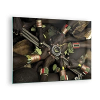 Cuadro sobre vidrio - Impresiones sobre Vidrio - Vides, un barril y copas con el sol poniente como telón de fondo - 70x50cm - Aquí la vida tiene un sabor - Decoración de pared moderna para salón y dormitorio ARTTOR