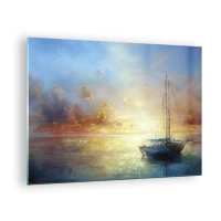 Cuadro sobre vidrio - Impresiones sobre Vidrio - Un velero en un mar tranquilo a la luz del sol poniente. - 70x50cm - Para una aventura - Decoración de pared moderna para salón y dormitorio ARTTOR