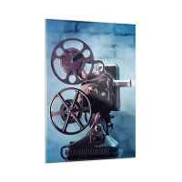 Cuadro sobre vidrio - Impresiones sobre Vidrio - Una cámara de cine de estilo retro contra una pared azul. - 50x70cm - En el antiguo cine - Decoración de pared moderna para salón y dormitorio ARTTOR