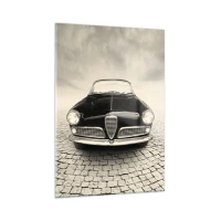 Cuadro sobre vidrio - Impresiones sobre Vidrio - Coche clásico en carretera adoquinada en blanco y negro - 50x70cm - ¿Y cómo no quererme? - Decoración de pared moderna para salón y dormitorio ARTTOR