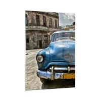 Cuadro sobre vidrio - Impresiones sobre Vidrio - Coche azul antiguo en la calle bajo el sol - 50x70cm - ¡Viva Cuba! - Decoración de pared moderna para salón y dormitorio ARTTOR