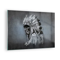 Cuadro sobre vidrio - Impresiones sobre Vidrio - Retrato de un hombre con un tocado de plumas sobre un fondo gris oscuro. - 70x50cm - Regreso a las raíces - Decoración de pared moderna para salón y dormitorio ARTTOR
