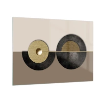 Cuadro sobre vidrio - Impresiones sobre Vidrio - Círculos geométricos en dorado y negro sobre fondo beige. - 70x50cm - Variaciones en torno a un círculo - Decoración de pared moderna para salón y dormitorio ARTTOR