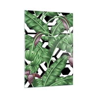 Cuadro sobre vidrio - Impresiones sobre Vidrio - Hojas y flores tropicales sobre un fondo con patrón geométrico en blanco y negro - 50x70cm - Composición simétrica de la naturaleza - Decoración de pared moderna para salón y dormitorio ARTTOR