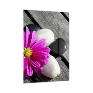 Cuadro sobre vidrio - Impresiones sobre Vidrio - Flor rosa con piedras sobre un fondo de madera. - 50x70cm - Descansando en el muelle - Decoración de pared moderna para salón y dormitorio ARTTOR