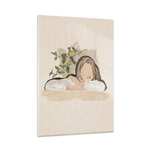 Cuadro sobre vidrio - Impresiones sobre Vidrio - Una mujer apoyada en una mesa entre las ramas de un limonero, con el rostro sin rasgos distintivos. - 50x70cm - La belleza del sur - Decoración de pared moderna para salón y dormitorio ARTTOR