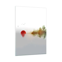 Cuadro sobre vidrio - Impresiones sobre Vidrio - Sol rojo sobre el agua y el contorno del bosque. - 50x70cm - Una promesa de paz - Decoración de pared moderna para salón y dormitorio ARTTOR