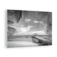 Cuadro sobre vidrio - Impresiones sobre Vidrio - Fotografía en blanco y negro de una playa tropical con un embarcadero. - 70x50cm - ¿Un recuerdo o un sueño? - Decoración de pared moderna para salón y dormitorio ARTTOR