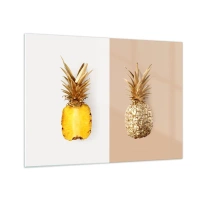 Cuadro sobre vidrio - Impresiones sobre Vidrio - Una piña cortada y dorada sobre dos fondos contrastantes. - 70x50cm - Piña y media - Decoración de pared moderna para salón y dormitorio ARTTOR