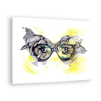 Cuadro sobre vidrio - Impresiones sobre Vidrio - Gafas con patrones artísticos y ojos sobre un fondo en tonos amarillos. - 70x50cm - A través de las gafas azules - Decoración de pared moderna para salón y dormitorio ARTTOR