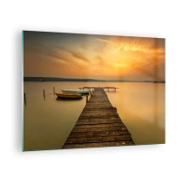 Cuadro sobre vidrio - Impresiones sobre Vidrio - Muelle en el lago al atardecer con un barco - 70x50cm - Abriré el cielo dorado para ti - Decoración de pared moderna para salón y dormitorio ARTTOR