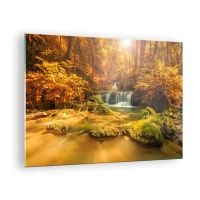 Cuadro sobre vidrio - Impresiones sobre Vidrio - Cascada forestal en oro - 70x50cm - Cascada forestal en oro - Decoración de pared moderna para salón y dormitorio ARTTOR