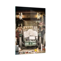 Cuadro sobre vidrio - Impresiones sobre Vidrio - Garaje antiguo con un coche cubierto por una tela, rodeado de herramientas y cajas. - 50x70cm - Volver al pasado - Decoración de pared moderna para salón y dormitorio ARTTOR