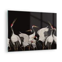 Cuadro sobre vidrio - Impresiones sobre Vidrio - Grullas blancas con cabezas rojas sobre fondo negro - 70x50cm - Asuntos de aves - Decoración de pared moderna para salón y dormitorio ARTTOR