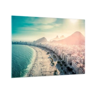 Cuadro sobre vidrio - Impresiones sobre Vidrio - Panorama de la playa con edificios urbanos y fondo de montaña - 70x50cm - Vacaciones perpetuas en Río - Decoración de pared moderna para salón y dormitorio ARTTOR