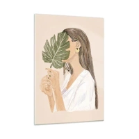 Cuadro sobre vidrio - Impresiones sobre Vidrio - Una mujer con cabello largo sosteniendo una hoja frente a su cara. - 50x70cm - Retrato misterioso con un abanico - Decoración de pared moderna para salón y dormitorio ARTTOR