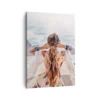 Cuadro sobre lienzo - Impresión de Imagen - Mujer en un barco con vistas a las montañas y al agua, estilo boho - 50x70cm - Rumbo a la felicidad - Decoración de pared moderna para salón y dormitorio ARTTOR