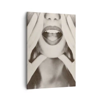 Cuadro sobre lienzo - Impresión de Imagen - Retrato en blanco y negro de una mujer con labios y manos expresivos. - 50x70cm - ¡Ya estoy en camino! - Decoración de pared moderna para salón y dormitorio ARTTOR