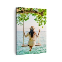 Cuadro sobre lienzo - Impresión de Imagen - Mujer en un columpio junto al mar en un paisaje tropical - 50x70cm - La vida es bella - Decoración de pared moderna para salón y dormitorio ARTTOR