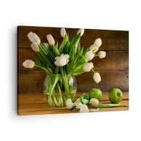 Cuadro sobre lienzo - Impresión de Imagen - Un ramo de tulipanes blancos en un jarrón de cristal con manzanas verdes. - 70x50cm - Jugoso y fresco en verde y blanco - Decoración de pared moderna para salón y dormitorio ARTTOR