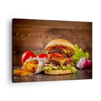 Cuadro sobre lienzo - Impresión de Imagen - Apetitosa hamburguesa con extras - 70x50cm - Fruta prohibida - Decoración de pared moderna para salón y dormitorio ARTTOR