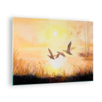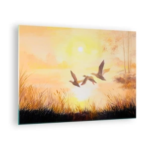 Cuadro sobre vidrio - Impresiones sobre Vidrio - Tres patos volando sobre un lago al amanecer - 70x50cm - El comienzo de un largo viaje - Decoración de pared moderna para salón y dormitorio ARTTOR